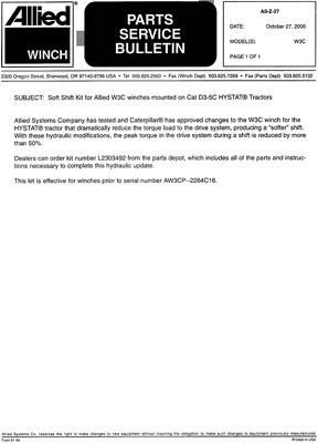 Parts Service Bulletins Provide Important Product UpdatesAllied Systems Company Winch division has recently issued two Parts Service Bulletins, both of which provide very valuable information for you and your customers. The first, Bulletin A99-Z-22, issued January 18, 2001, covers product improvements to the Allied W428-3 winch. The second bulletin, A0-Z-27, released October 27, 2000, details a soft shift kit for the W3C winches mounted on Cat D3C-D5C Hystat tractors.